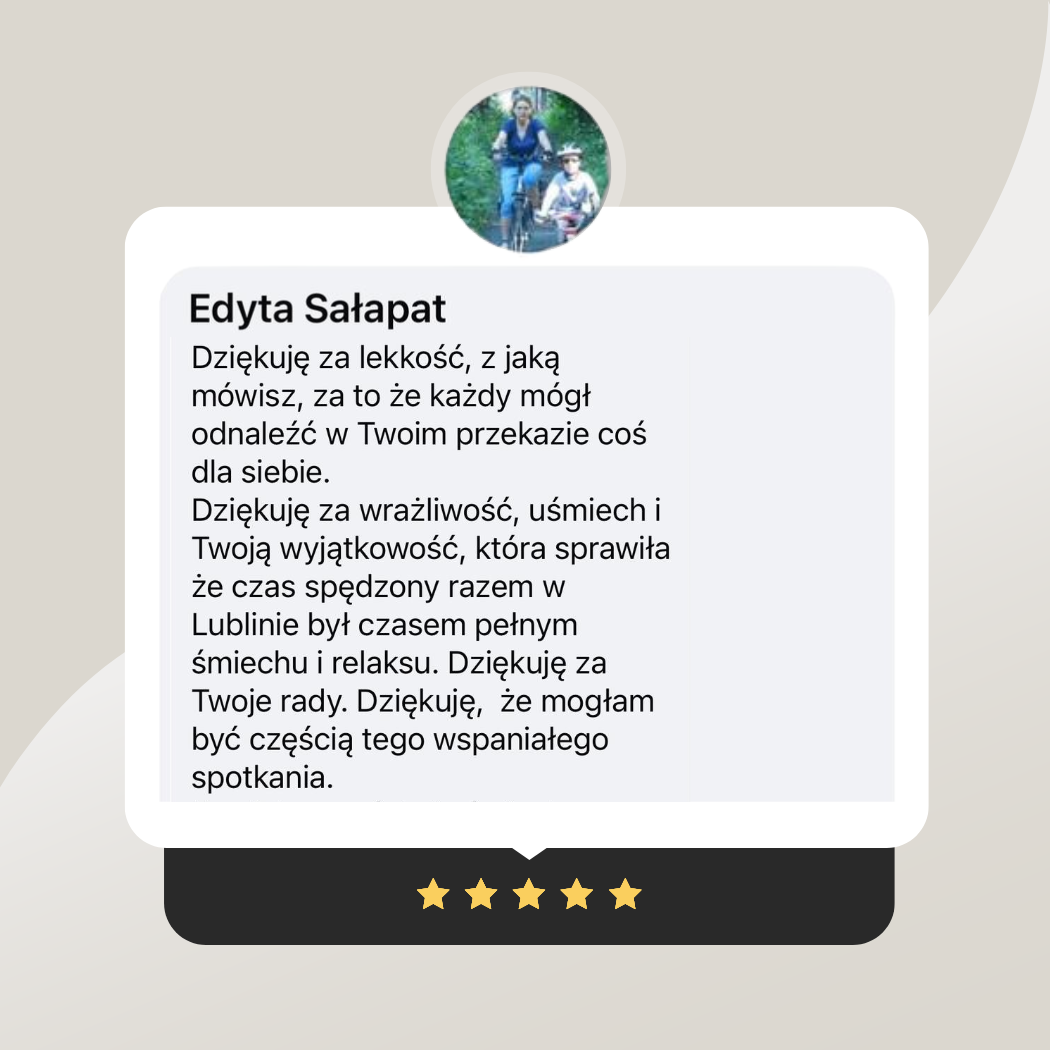 Te materiały to wspaniałe uzupełnienie dla każdego, kto uczestniczy w spotkaniu stacjonarnie i pragnie pogłębić swoją wiedzę oraz efektywnie pracować nad relacjami. Materiały zostaną Ci wręczone na miejscu w formie gotowych, wydrukowanych arkuszy i będą wykorzystywane podczas wydarzenia. Znajdziesz w nich specjalnie opracowane materiały edukacyjne, które pozwolą Ci: