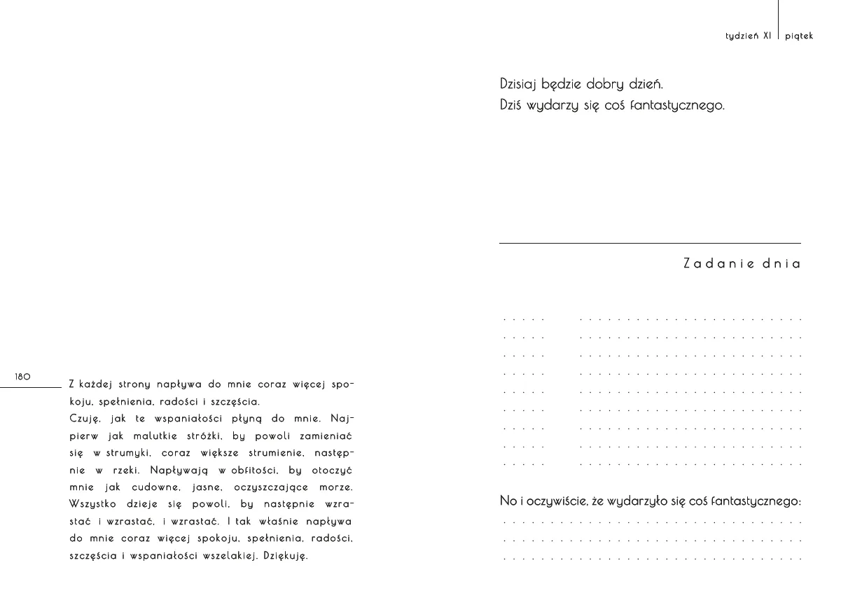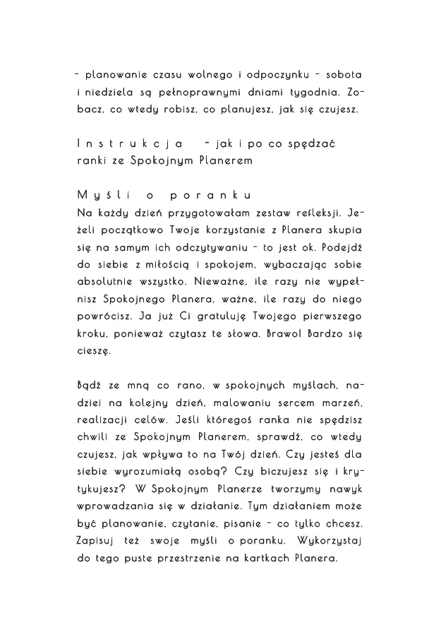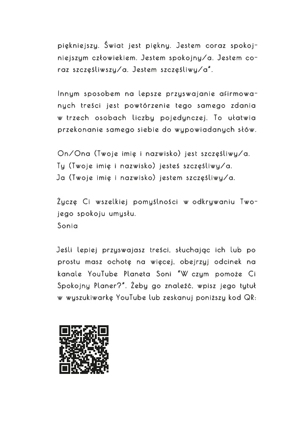 “Decyduję zaprosić do mojego życia więcej spokoju, jeszcze więcej spokoju, decyduję się na spokojne planowanie, które pozwala smakować życie, przyciąga spokojne sytuacje i ludzi. Życie zwalnia, przyjemnie zaskakuje. Decyduję się na Spokojny Planer”.